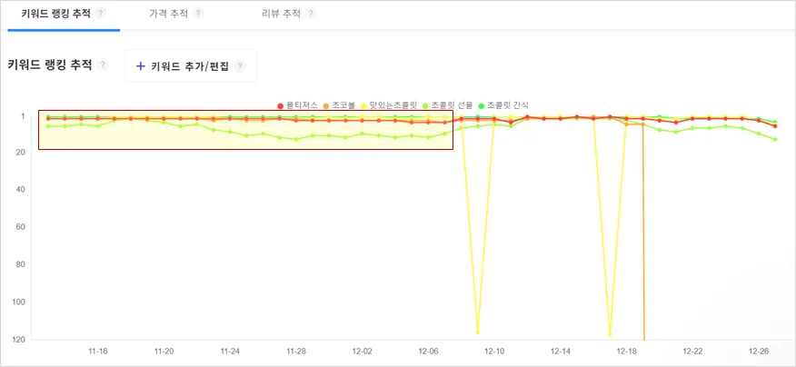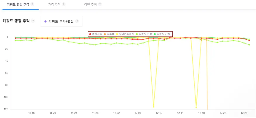 위에서 예시로 든 몰티져스 초콜릿 상품의 경우, 대부분의 키워드에서 상위 노출되고 있는 것을 확인할 수 있었습니다. 하지만 차트를 조금 더 자세히 보면 한가지 시사점을 발견할 수 있습니다. 예시 차트에서 11월 말부터 12월 중순까지 '초콜릿 간식' 키워드에 대해서만 다른 키워드들에 비해 순위가 조금 낮다는 점, 혹시 발견하셨나요?