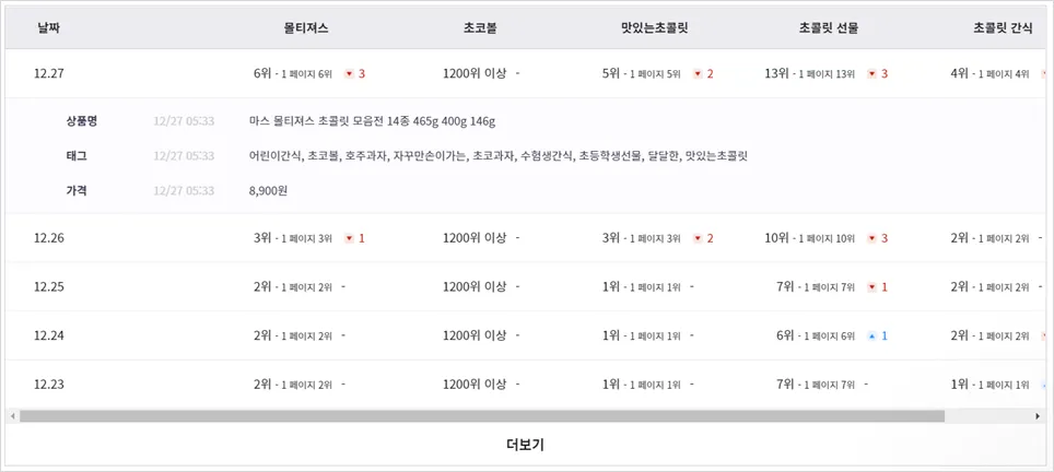 해당 예시 상품에는 현재 '몰티져스', '초코볼', 맛있는초콜릿, '초콜릿 선물', '초콜릿 간식' 5개 키워드가 등록되어 있습니다. 먼저 차트를 보겠습니다. 많은 상품에서 1,2위를 하고 있는것을 확인할 수 있네요! (부럽다...