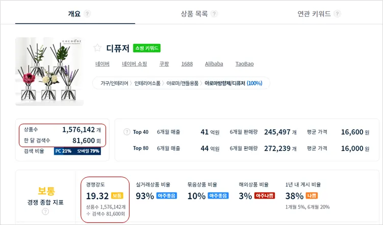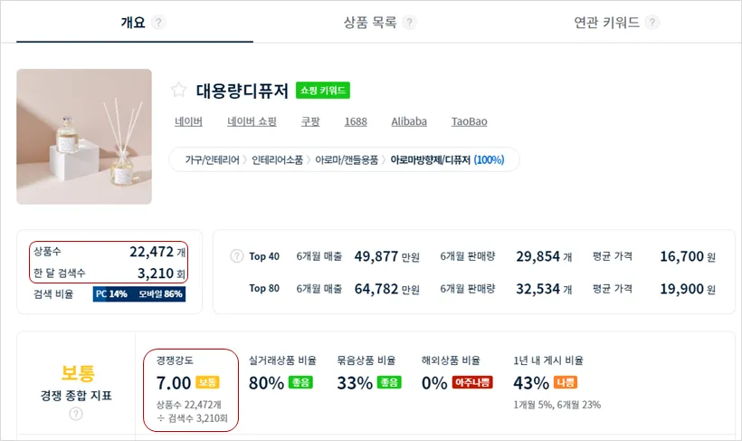 하지만 '디퓨저'라는 메인 키워드에 '실내', '대용량'이라는 세부 키워드 정도만 추가해줘도 경쟁을 대폭 낮출 수 있음을 확인할 수 있습니다. '실내디퓨저'와 '대용량디퓨저'의 상품 등록수는 각각 10만개, 2만개로, 메인 키워드에 등록된 상품수보다 훨씬 낮음을 확인할 수 있습니다. 때문에, 상품명에 '실내디퓨저', '대용량디퓨저'를 사용하는 것이 상품의 노출 순위 상승에 더 유리하겠죠.