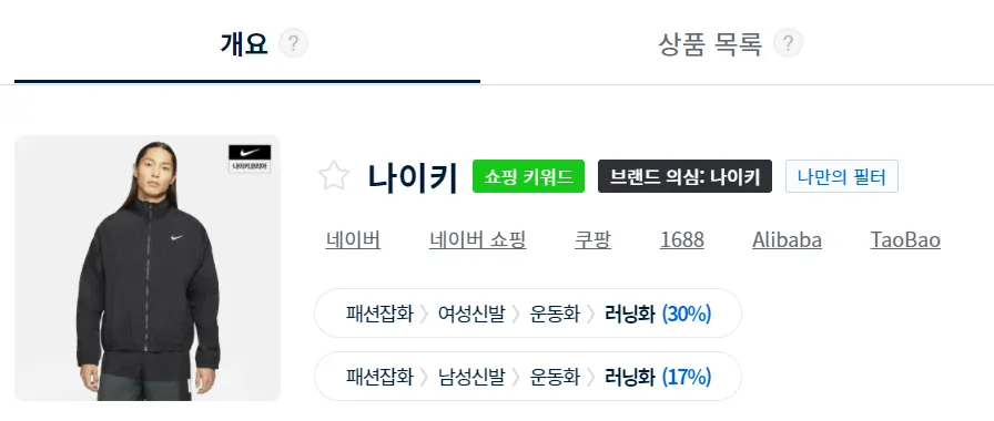 개요 탭의 상단에는 1등 상품 대표 사진 / 즐겨찾기 / 브랜드 알림 / 쇼핑 키워드 정보 / 필터 정보 / 타 쇼핑 플랫폼 링크 / 카테고리 분포도가 있습니다.