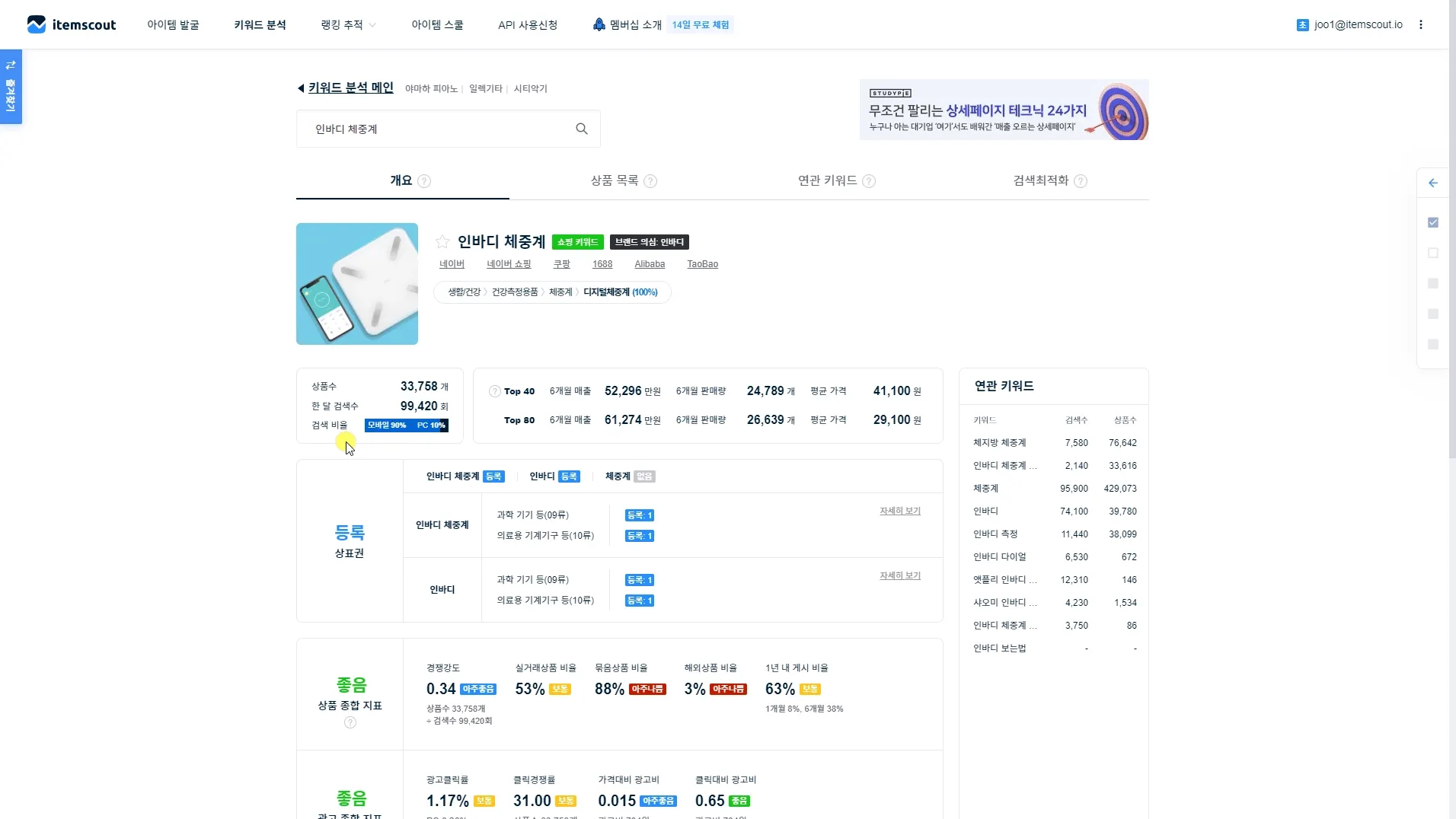 키워드 기본 정보 하단에서는 키워드 관련 상품수 / 한 달 검색수 / Top 40/80 매출 데이터 / 상표권 / 각종 종합 지표를 확인할 수 있습니다.