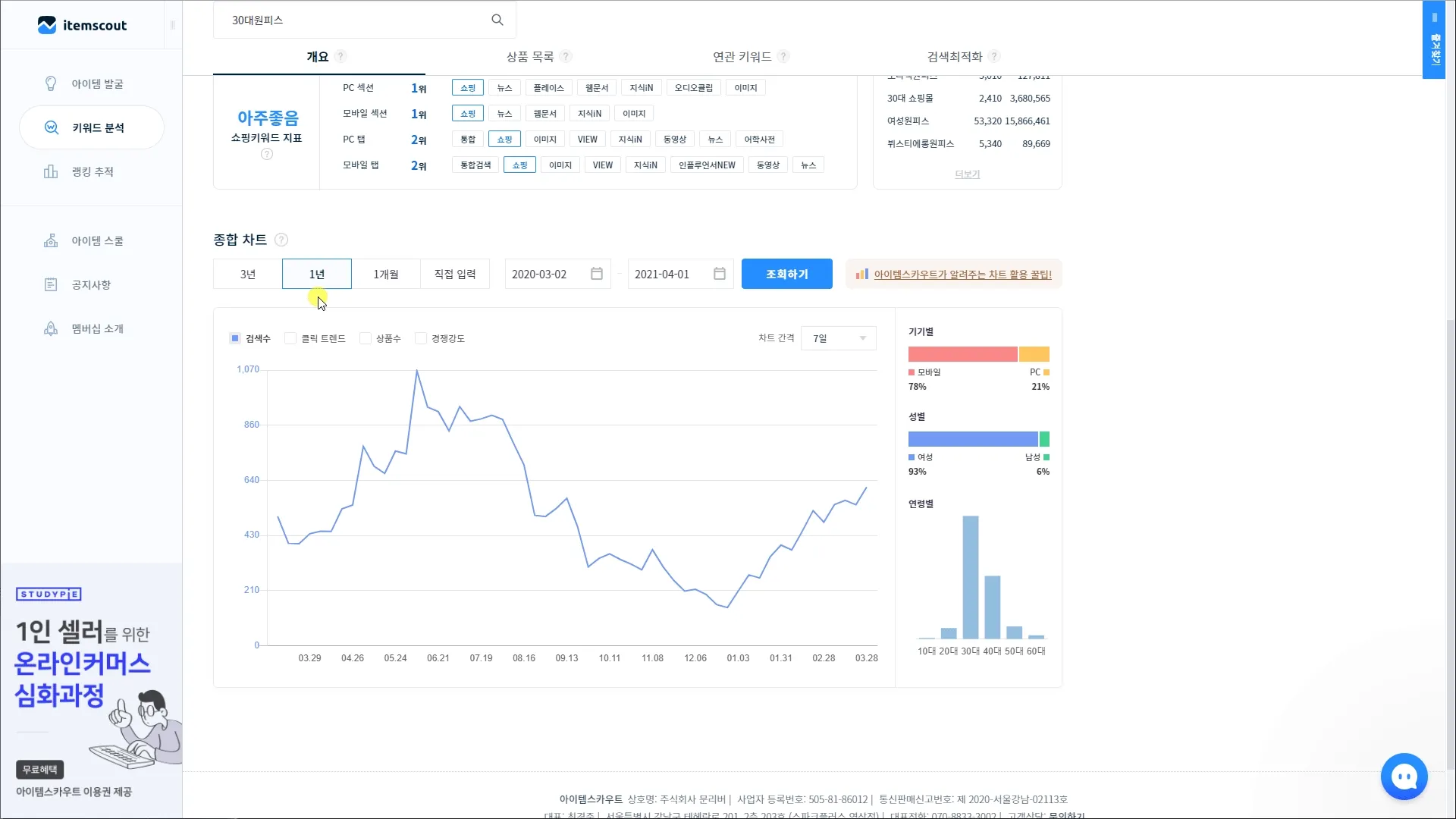 개요 탭 하단의 종합 차트에서는 검색수 / 클릭트렌드 / 상품수 / 경쟁강도 / 성별 비율 / 연령 분포를 확인할 수 있습니다. 차트의 데이터는 네이버에서 제공하는 데이터를 기준으로 합니다.
