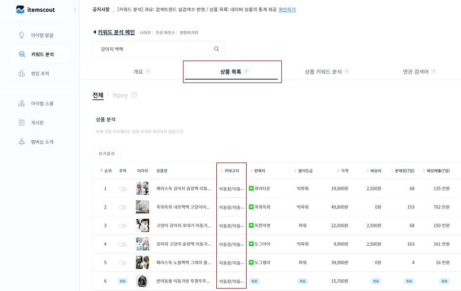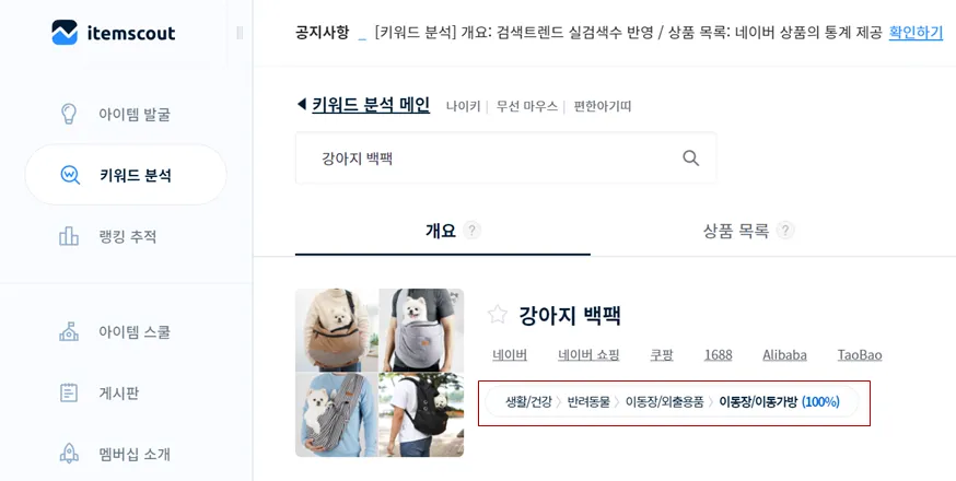 네이버 쇼핑 제공 자료의 작성 시점으로부터 카테고리의 변화가 있었던것으로 보이네요. 현재 "강아지 백팩" 키워드과 관련된 모든 상품은 100% "생활/건강 > 반려동물 > 이동장/외출용품 > 이동장/이동가방"이라는 카테고리에 등록되어 있는 것을 확인할 수 있습니다.
