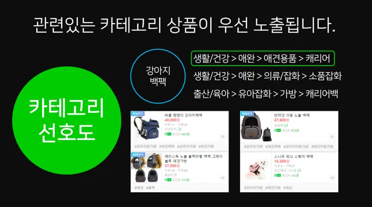 네이버 쇼핑의 예시를 살펴보겠습니다. "강아지 백팩" 이라는 키워드에는 아래 그림과 같이 다양한 카테고리에 상품들이 등록되어 있었다고 합니다. 그 중, 소비자들이 가장 많이 찾는 카테고리는 "생활/건강 > 애완 > 애견용품 > 캐리어" 카테고리에 등록되어 있는 상품이었구요. 따라서, 네이버 검색 알고리즘은 "강아지 백팩" 키워드를 검색했을 때, 해당 카테고리에 속해있는 상품들에게 노출 가중치를 부여했습니다.