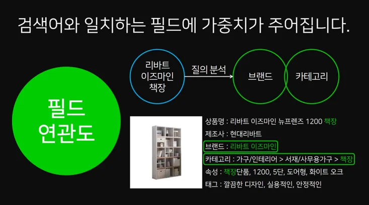 소비자가 "리바트 이즈마인 책장"이라는 키워드를 입력했다면, "리바트 이즈마인"이라는 키워드는 브랜드 필드에, "책장"은 카테고리 필드에 가중치가 부여될 것입니다. 이런 경우라면, 같은 상품명 및 속성을 사용했다고 하더라도 브랜드 및 카테고리에 "리바트 이즈마인", "책장"을 정확하게 기입한 상품들이 우선적으로 노출됩니다.