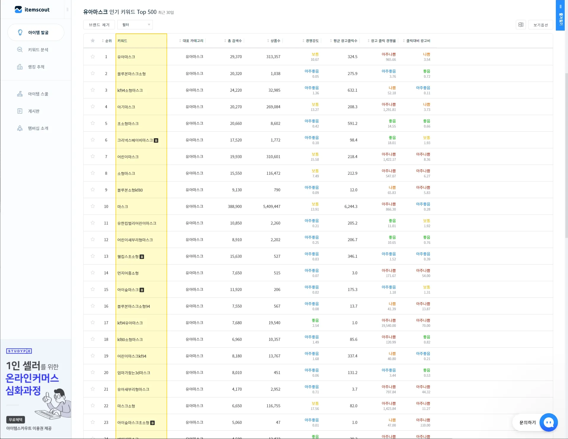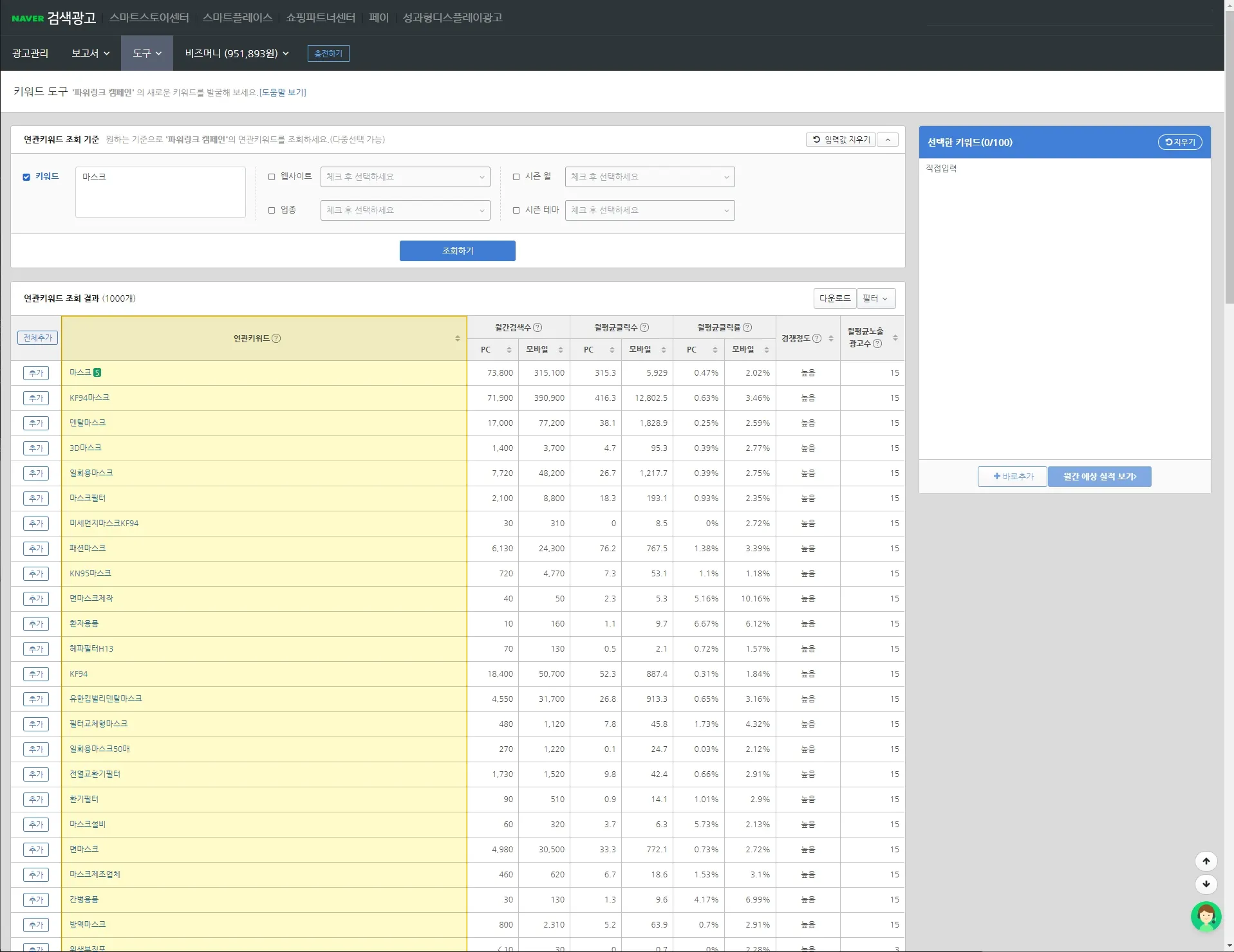 키워드 도구에서 검색 후, 검색창 하단의 연관 검색어로 노출되는 검색어 Top 50입니다.