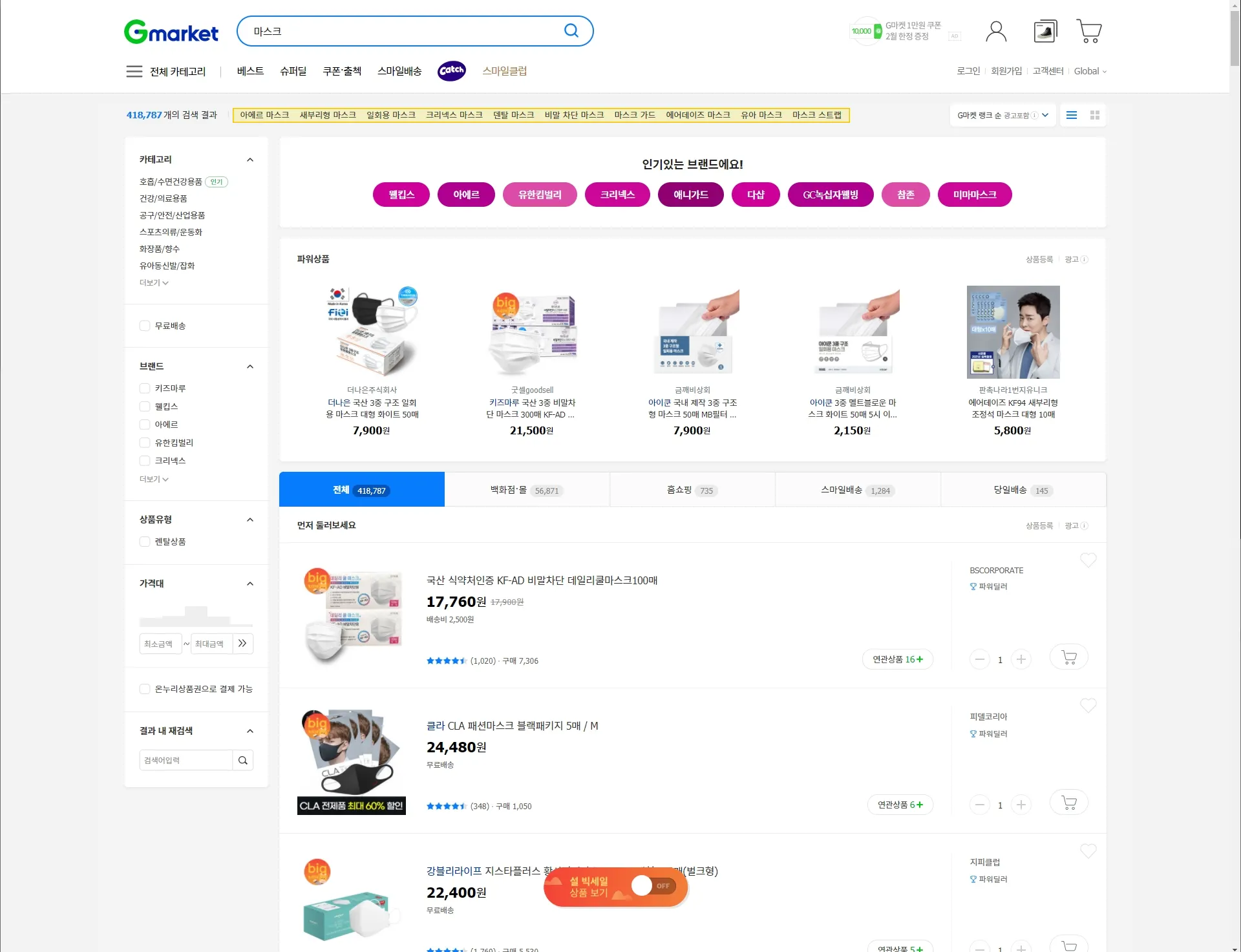 지마켓에서 검색 후, 검색창 하단의 연관 검색어로 노출되는 검색어입니다.