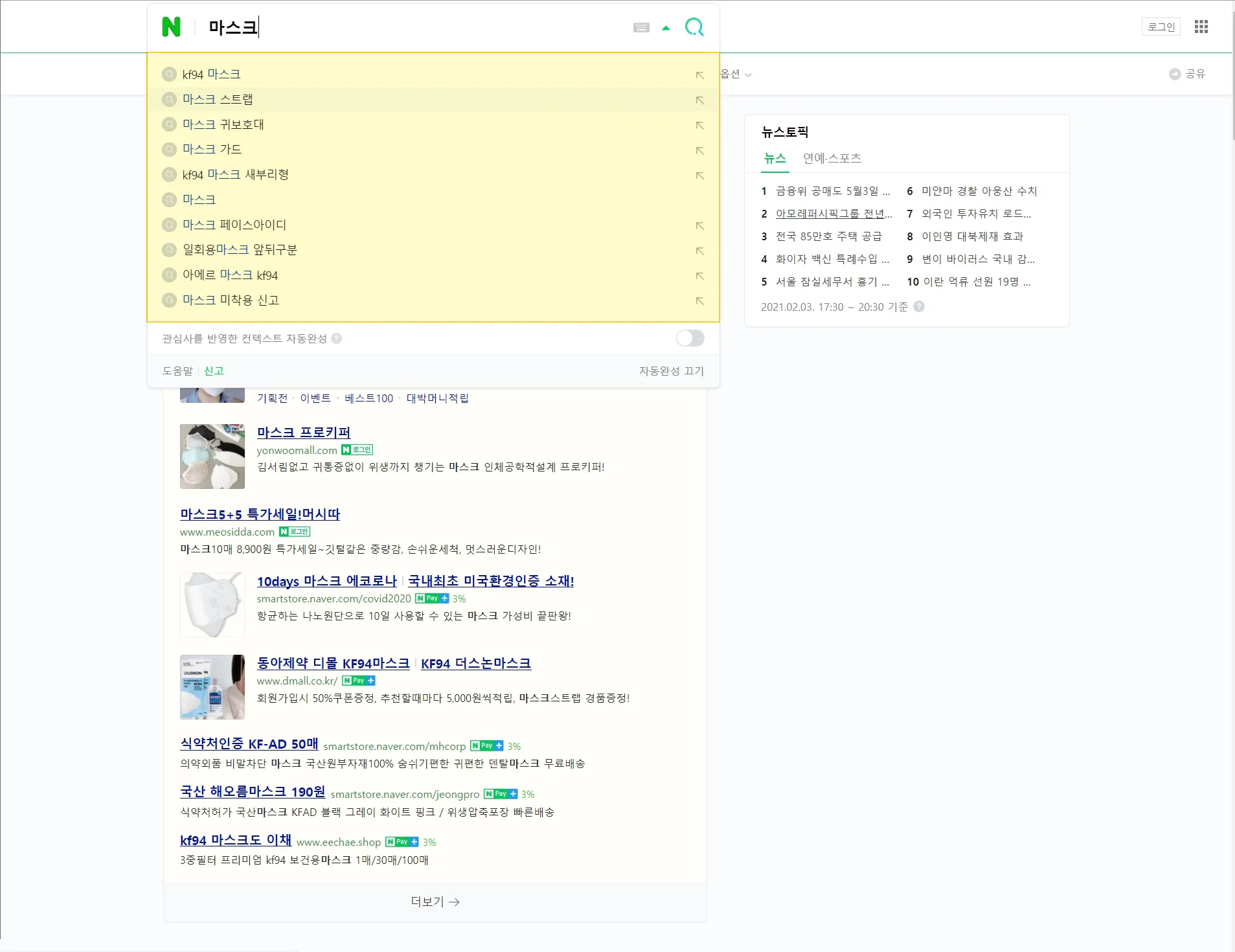 네이버 통합 검색 시, 검색창에 자동 완성되는 검색어입니다.