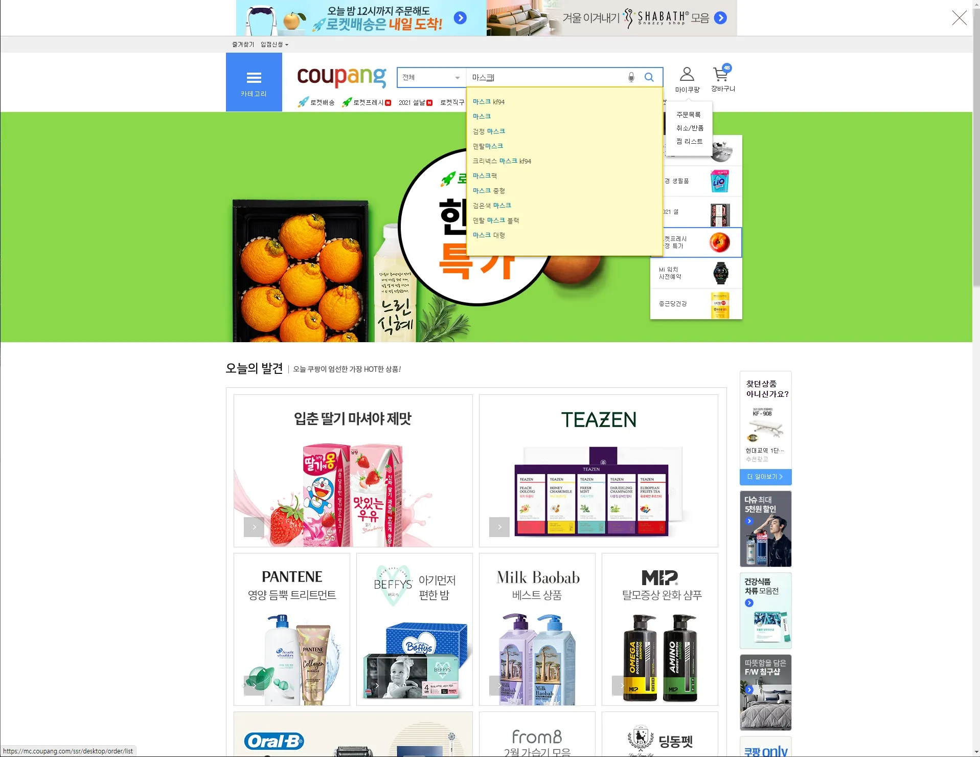 쿠팡에서 검색 시, 검색창에 자동 완성되는 검색어입니다.