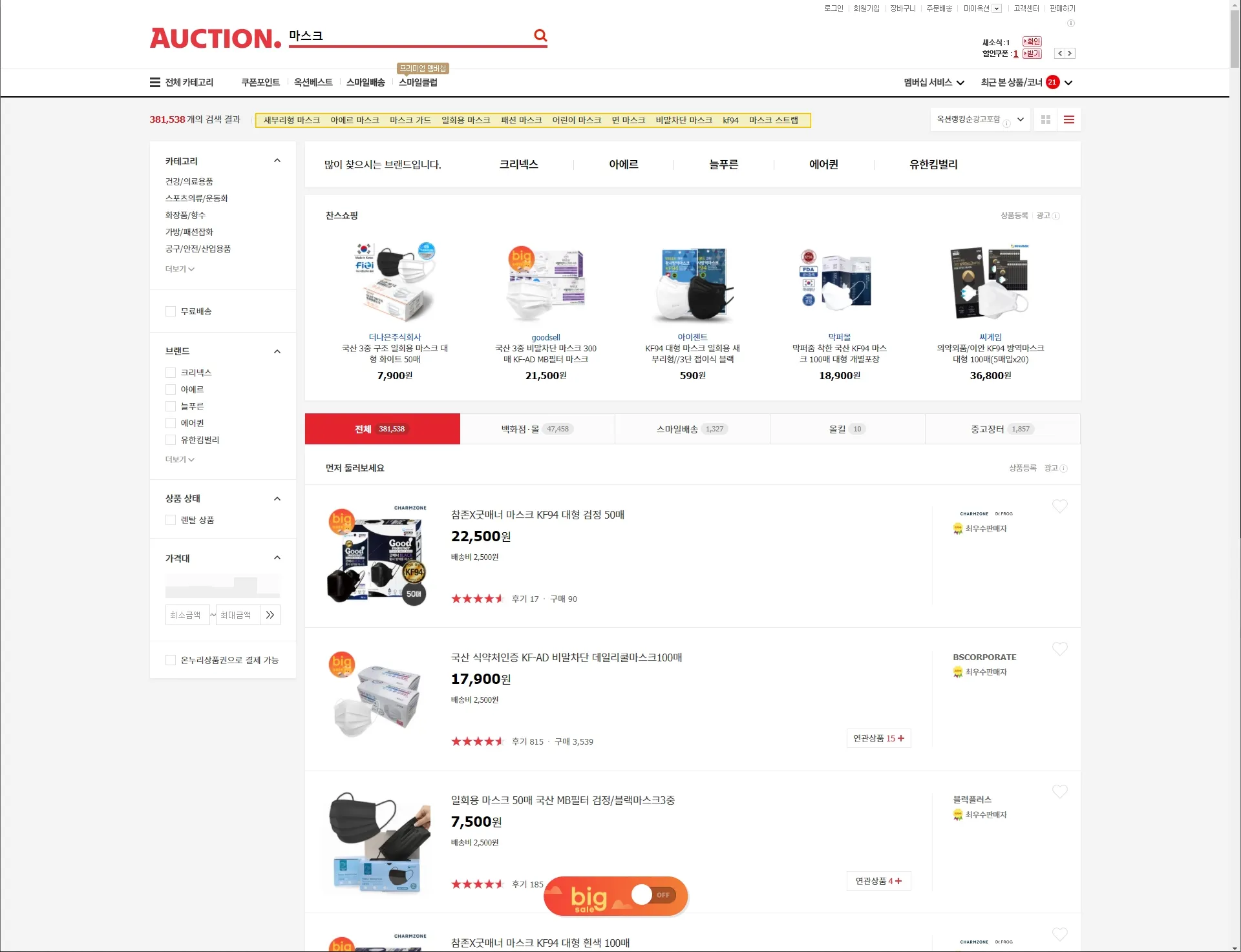 옥션에서 검색 시, 검색창에 자동 완성되는 검색어입니다.