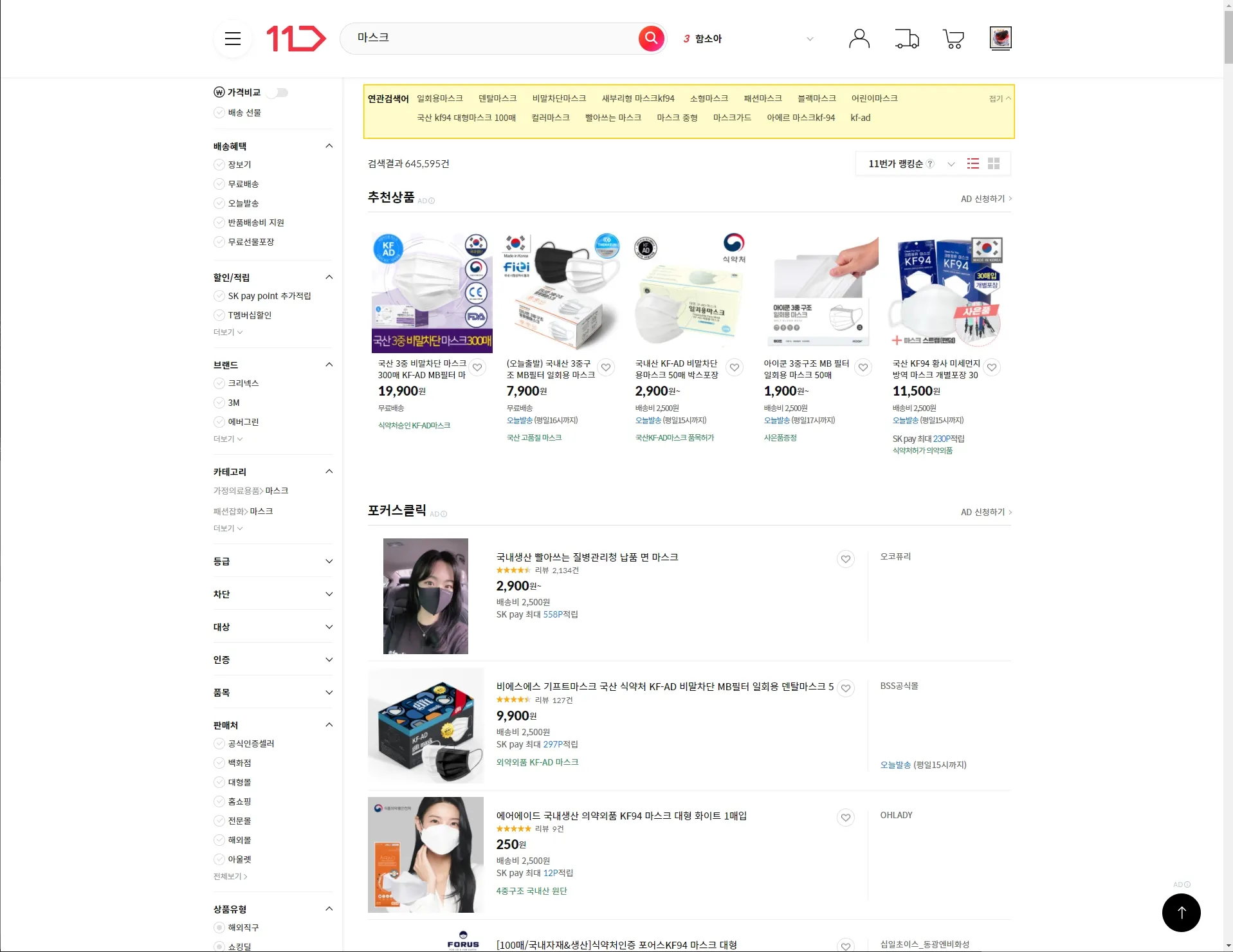 11번가에서 검색 후, 검색창 하단의 연관 검색어로 노출되는 검색어입니다.