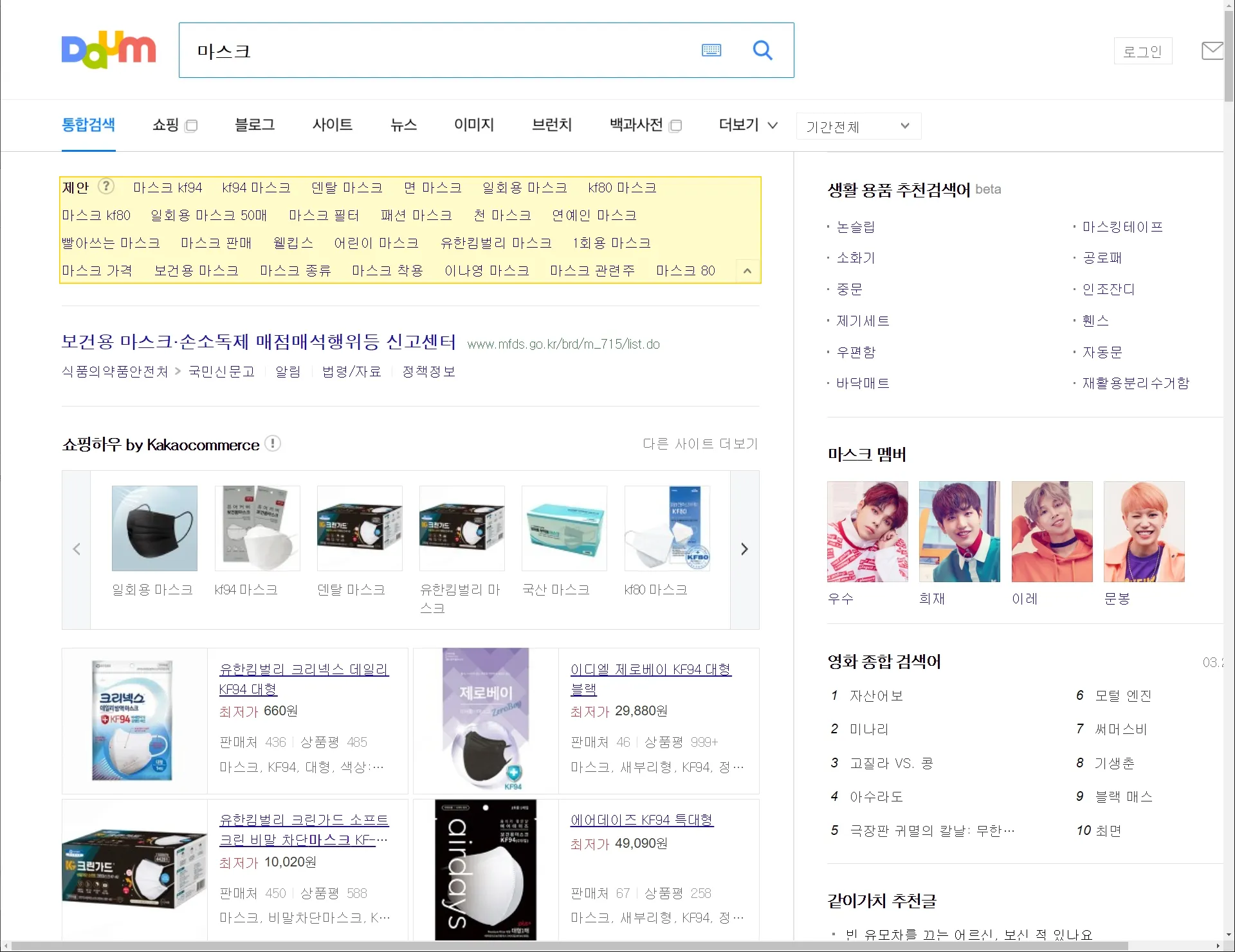 다음 통합 검색 시, 검색창에 자동 완성되는 검색어입니다.
