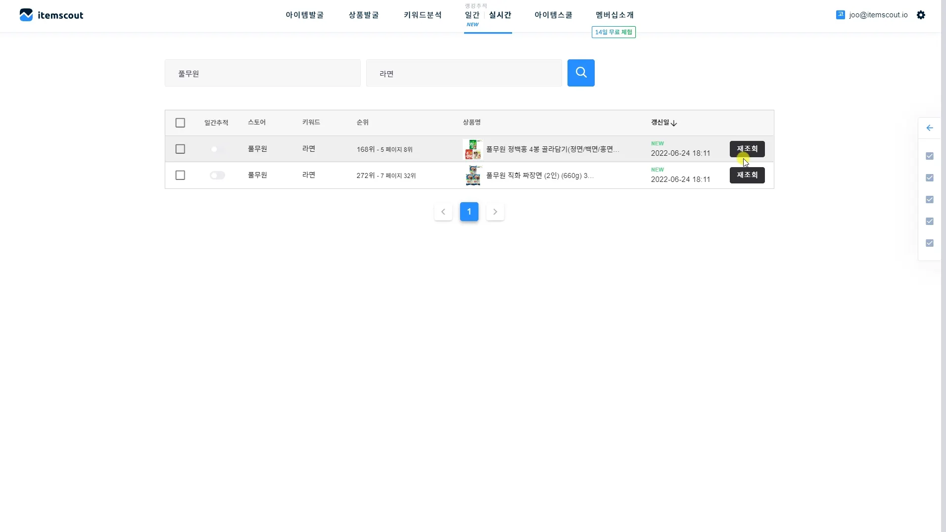 목록 우측의 "재조회" 버튼을 이용해서 언제든 실시간으로 상품의 노출순위를 다시 확인할 수 있습니다.