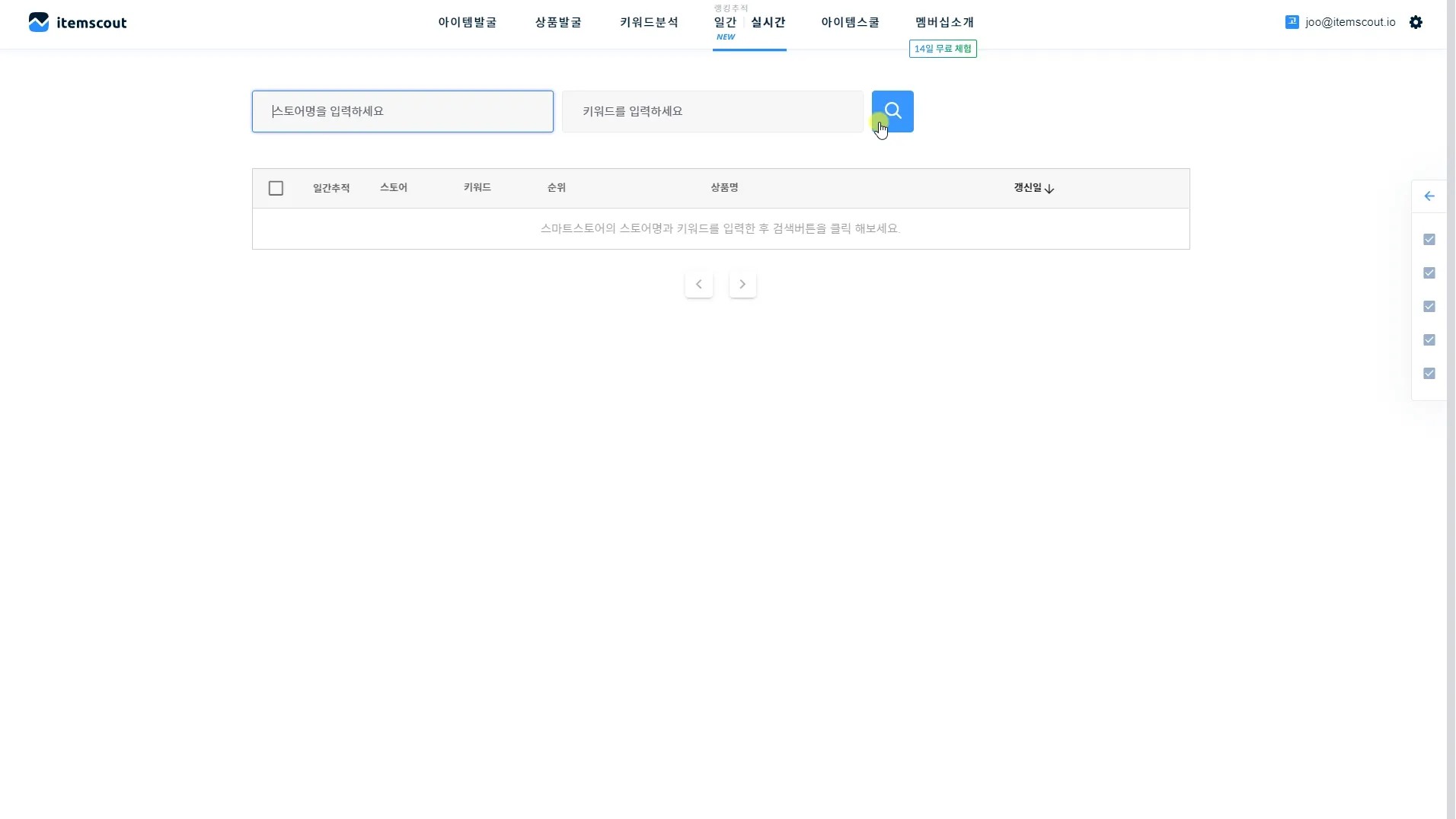 추적하고자 하는 상품을 판매하고 있는 스토어명, 그리고 해당 상품에 사용되고 있는 키워드 두가지만 있다면 바로 실시간 랭킹추적을 사용하실 수 있습니다.